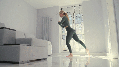 바닥에 서서 오른쪽 다리는 뒤로 뻗습니다. 그리고 공중으로 들었다가 내리면서 킥백 동작을 진행하세요. 손은 가슴 앞에서 모으세요. 30초 동안 진행합니다. 그런 다음 왼쪽 다리로 바꿔서 동일하게 30초 반복합니다.