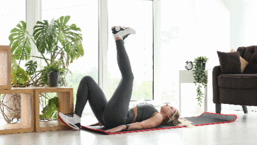 매트에 등을 대고 눕습니다. 오른쪽 무릎은 당겨서 세우고, 왼쪽 다리는 공중으로 뻗으세요. 바닥과 90도 각도를 만듭니다. 그리고 엉덩이를 들었다가 내리면서 업다운 동작을 30초 진행하세요. 반대편 다리로 30초 진행합니다.
