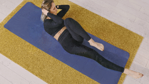 매트에 누워서 손을 머리 옆으로 가져갑니다. 그리고 상체는 약간 일으키고, 다리는 공중으로 들어줍니다. 그런 다음 한쪽 무릎을 당기면서 상체를 틀었다가 반대편 무릎을 당기면서 틀어줍니다. 1분 동안 운동하세요.