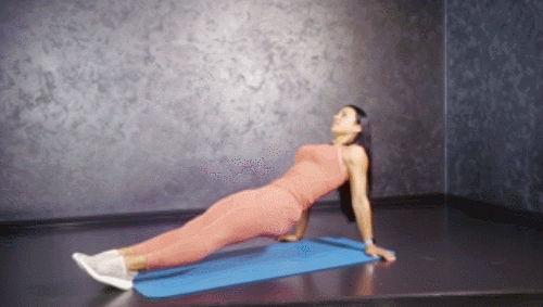 매트에 앉은 상태로 몸을 공중으로 들어서 리버스 플랭크 자세를 만듭니다. 그리고 오른발을 오른쪽으로 뻗었다가 돌아오고, 왼발을 왼쪽으로 뻗었다가 돌아오세요. 1분 동안 반복하여 움직입니다.