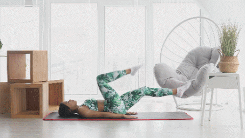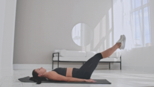 매트에 눕고, 왼쪽 다리는 공중으로 들어줍니다. 바닥과 90도 각도를 만드세요. 그리고 오른쪽 다리도 들어줍니다. 바닥에 내린 후, 이번에는 동시에 들어주세요. 무릎을 구부렸다가 펴는 동작을 진행할 수도 있습니다. 1분간 반복하세요.