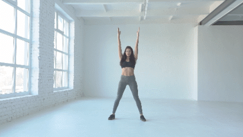 어깨너비보다 넓게 다리는 벌리고 바닥에 서서 시작하세요. 그리고 팔을 머리 위로 올리고, 상체를 앞으로 숙이면서 팔을 내립니다. 그런 다음 엉덩이를 내려서 스쿼트 자세를 만드세요. 다시 팔을 들고, 원래 자세로 돌아옵니다. 1분간 반복하세요.