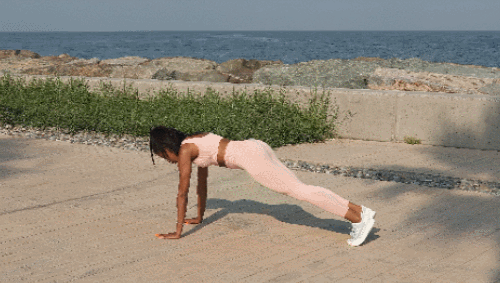 플랭크 자세로 엎드려서 자세를 잡습니다. 그리고 왼쪽 팔꿈치를 구부리고, 오른쪽 팔꿈치를 구부려서 팔꿈치 플랭크 자세로 전환합니다. 다시 팔꿈치를 차례로 펴고, 원래 자세로 돌아오세요. 1분 동안 진행합니다.