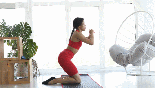 매트에 무릎을 꿇고 앉아서 준비합니다. 그리고 오른쪽 무릎을 세우고, 왼쪽 무릎을 세워서 스쿼트 동작으로 연결합니다. 다시 무릎을 구부리고, 원래 자세로 돌아오면 되는데요. 1분 동안 운동합니다.