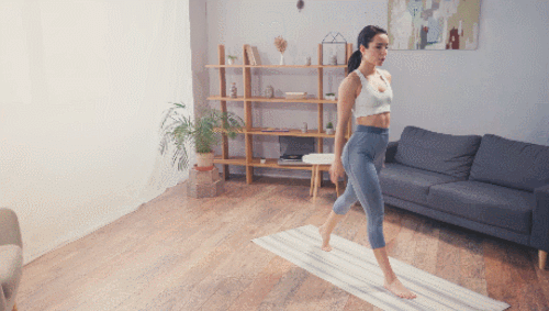 매트에 다리는 모으고 서서 시작합니다. 그리고 오른발을 앞으로 뻗고, 손은 가슴 앞으로 모아줍니다. 그런 다음 무릎을 구부리면서 런지 동작을 진행하세요. 30초 진행합니다. 다리 위치를 바꿔서 30초 반복하세요.