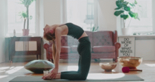 매트에 무릎을 꿇고 앉은 상태로 준비하세요. 그리고 상체를 일으키고, 손을 뒤로 뻗어서 낙타 자세로 전환합니다. 손으로 발을 잡거나 바닥을 지탱하세요. 자세를 유지하면서 호흡합니다. 1분 동안 진행하세요.
