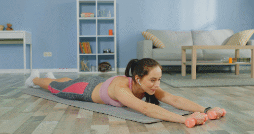 매트에 배를 대고 엎드린 상태에서 준비합니다. 손에는 아령이나 생수를 들어주세요. 그리고 왼팔을 들면서 오른발을 들었다가 오른팔을 들면서 왼발을 들어주세요. 수영을 하는 것처럼 1분 동안 운동하세요.