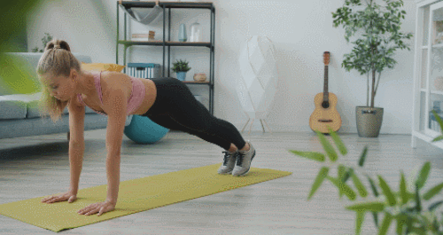 플랭크 기본자세로 매트에 엎드리세요. 그리고 왼발을 공중으로 들었다가 내리고, 오른발을 공중으로 들었다가 내립니다. 자세를 유지하면서 1분 동안 다리를 계속 움직입니다. 시선은 바닥을 응시하세요.