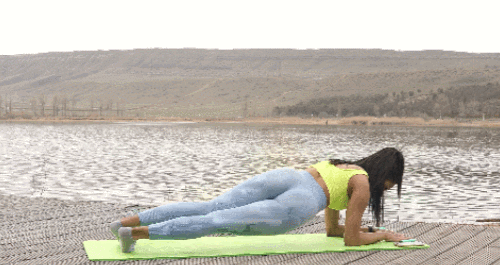 매트에 엎드려서 팔꿈치를 구부리고, 팔꿈치 플랭크 자세를 잡습니다. 그리고 엉덩이를 오른쪽으로 내렸다가 돌아오고, 왼쪽으로 내렸다가 돌아옵니다. 1분 동안 엉덩이를 좌우로 움직이세요.