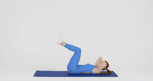매트에 누운 상태로 다리는 공중으로 들고, 무릎을 구부립니다. 그리고 손은 머리 뒤로 보내서 잡으세요. 그런 다음 상체를 일으켰다가 내리는 동작을 반복하면 되는데요. 1분 동안 진행하고, 복부의 자극을 유지합니다.