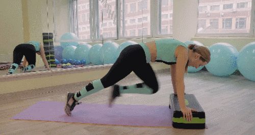 스텝박스나 경사가 있는 곳에 손을 대고 엎드립니다. 그리고 플랭크 자세를 잡으세요. 그런 다음 왼쪽 무릎을 당겼다가 되돌리고, 오른쪽 무릎을 당기는 동작으로 연결합니다. 1분 동안 번갈아 움직이세요. 시선은 바닥을 향합니다.