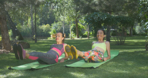 매트에 누운 상태로 무릎을 당겨서 세웁니다. 그리고 팔은 앞으로 뻗고, 상체를 약간 일으키세요. 그런 다음 상체를 좌우로 움직이는 동작을 진행하면 되는데요. 1분 동안 자세를 유지하면서 운동합니다.