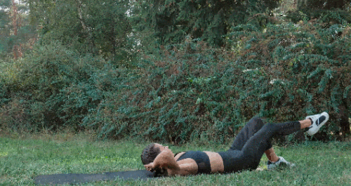 매트에 누운 상태로 왼쪽 무릎을 세우고, 오른쪽 다리는 펴줍니다. 손은 머리 뒤로 보내서 잡으세요. 그리고 오른쪽 무릎을 당기면서 상체를 일으키는 동작을 진행하세요. 30초 운동 후, 다리 위치를 바꿔서 30초 진행합니다.