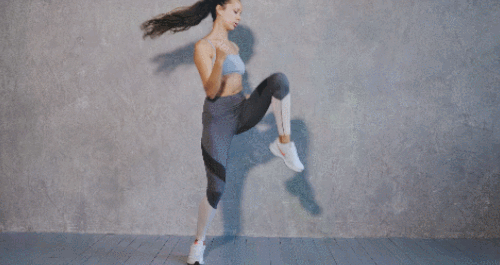 바닥에 서서 다리는 충분히 벌려줍니다. 그리고 오른쪽 무릎을 공중으로 당기면서 팔꿈치를 구부리면서 팔을 내립니다. 이번에는 왼쪽 무릎을 공중으로 당기면서 반복하세요. 1분 동안 번갈아 진행합니다.