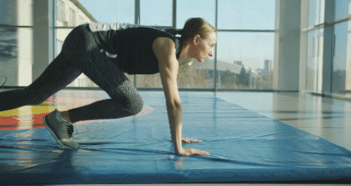 매트에 엎드려서 플랭크 자세를 잡습니다. 그리고 점프 동작과 함께 오른쪽 무릎을 당겼다가 점프와 함께 다리 위치를 바꿔서 왼쪽 무릎을 당겨주세요. 1분 동안 번갈아 당기는 동작을 진행하면 되는데요. 속도를 빠르게 하면서 반복합니다.