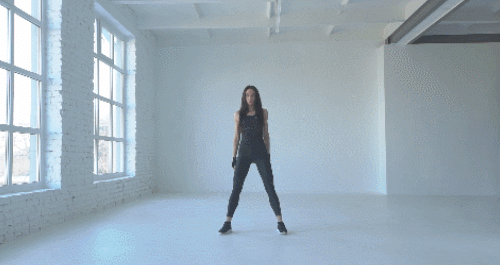 어깨너비보다 넓게 다리는 벌리고 서서 시선은 정면을 바라봅니다. 그리고 무릎을 구부리면서 엉덩이를 내려서 와이드 스쿼트 동작을 진행하세요. 이때 손은 가슴 앞에서 모았다가 내려줍니다. 1분 동안 운동하세요.