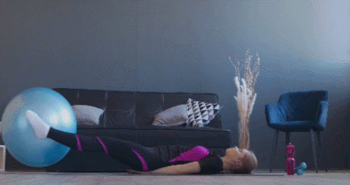매트에 누운 상태에서 다리 사이에는 짐볼을 끼웁니다. 그리고 상체는 바닥에서 뜨지 않도록 복부에 힘을 주세요. 천천히 짐볼을 들었다가 내리면서 레그레이즈 동작을 1분 동안 진행합니다.