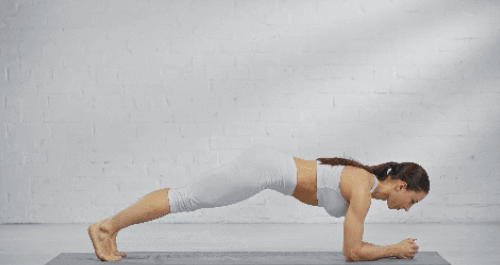 매트에 팔뚝을 대고 팔꿈치 플랭크 자세로 준비하세요. 그리고 시선은 바닥으로 향하고, 오른쪽 다리는 공중으로 들어주세요. 천천히 들었다가 내리면서 2회 반복합니다. 그런 다음 왼쪽 다리로 진행하세요. 1분간 운동합니다.
