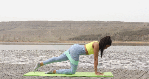 매트에 네발기기 자세로 엎드립니다. 그리고 오른쪽 다리는 들고, 90도로 무릎을 구부리세요. 그런 다음 공중으로 들었다가 내리면서 30초 운동합니다. 이번에는 왼쪽 다리로 30초 반복하세요.