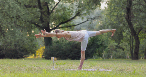 매트에 서서 다리는 모으고 준비합니다. 그리고 왼발로 버티면서 오른발을 뒤로 뻗고, 상체는 앞으로 숙이세요. 동시에 팔을 앞으로 뻗습니다. T자 모양으로 만드세요. 최대한 버팁니다. 발을 바꿔가며 버티는 동작을 1분간 진행하세요.