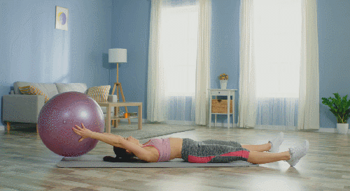 매트에 누운 상태로 손에는 짐볼을 잡습니다. 그리고 상체와 하체를 동시에 공중으로 들어주면서 손에 있는 짐볼을 다리 사이로 옮기세요. 이번에는 다리의 짐볼을 손으로 옮깁니다. 1분 동안 반복하세요.