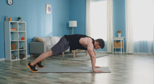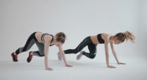 플랭크 자세로 바닥에 엎드리세요. 그리고 오른쪽 무릎을 대각선 방향으로 당겼다가 되돌리고, 왼쪽 무릎을 대각선 방향으로 당겼다가 되돌립니다. 점차 속도를 빠르게 움직이세요. 1분 동안 반복합니다.