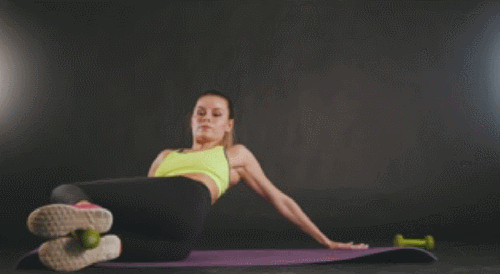 매트에 엉덩이를 대고 앉고, 손은 옆으로 펼쳐서 바닥에 지탱합니다. 그리고 다리는 공중으로 들어주세요. 그런 다음 왼쪽으로 틀었다가 돌아오고, 오른쪽으로 틀었다가 돌아옵니다. 1분 동안 비트는 동작을 반복하세요.
