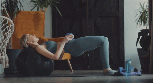 소파나 짐볼에 등을 대고 누워서 준비하세요. 손에는 아령이나 생수병을 들어줍니다. 그리고 골반 위에 올려서 잡으세요. 그런 다음 엉덩이를 들었다가 내리면서 운동하면 되는데요. 엉덩이의 움직임에 집중하면서 1분간 운동합니다.