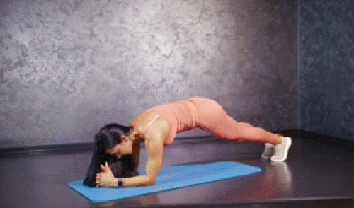 매트에 엎드려서 팔꿈치 플랭크 자세를 잡습니다. 그리고 왼쪽 무릎을 대각선 방향으로 당겼다가 되돌리세요. 이번에는 오른쪽 무릎을 대각선 방향으로 당겼다가 되돌립니다. 1분 동안 무릎을 번갈아 당겨주면서 운동하세요.