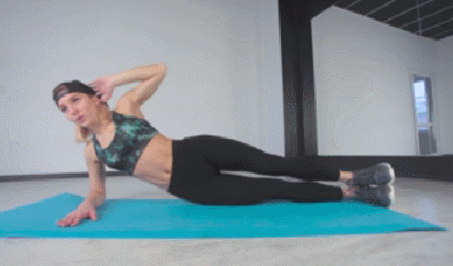 오른쪽 팔뚝을 매트에 대고 옆으로 눕습니다. 그리고 왼손은 머리 옆으로 가져가세요. 엉덩이를 들어서 사이드 팔꿈치 플랭크 자세를 만듭니다. 그런 다음 엉덩이를 내렸다가 들면서 업다운 동작을 30초 진행하세요. 반대편으로 자세를 바꿔서 30초 반복합니다.