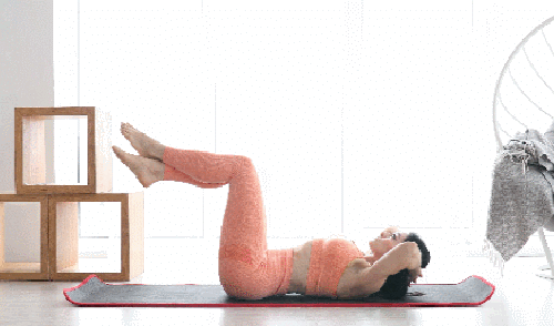 매트에 누운 상태에서 다리는 공중으로 들고, 무릎을 구부립니다. 다리는 교차하세요. 그리고 손은 머리 뒤로 보냅니다. 그런 다음 상체를 일으켰다가 내리면서 크런치 동작을 반복하세요. 1분 동안 운동합니다.