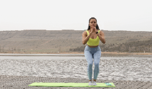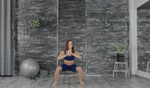 어깨너비로 다리는 벌리고 매트에 서서 준비합니다. 그리고 무릎을 구부리면서 자세를 낮추고, 손은 가슴 앞으로 모아주세요. 엉덩이를 충분히 내린 상태에서 자세를 유지하고 버티면 되는데요. 1분 동안 버티는 자세를 반복합니다.