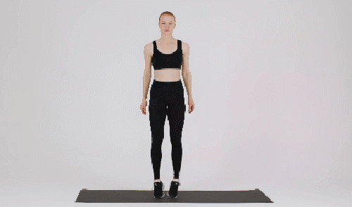 다리는 충분히 벌릭 매트에 서서 시작하세요. 그리고 스쿼트 동작을 진행합니다. 원래 자세로 돌아오면서 살짝 점프하여 발을 모았다가 다시 점프하여 발을 벌리고, 스쿼트 동작으로 연결합니다. 1분 동안 운동하세요. 시선은 정면을 바라봅니다.