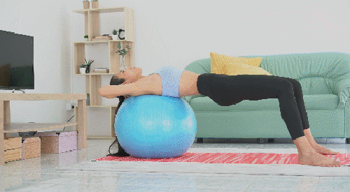 짐볼이나 소파에 등을 기대서 눕습니다. 그리고 손은 머리 뒤로 보내서 잡습니다. 그런 다음 엉덩이를 바닥으로 내렸다가 천천히 드는 동작을 반복하면 되는데요. 엉덩이의 움직임에 집중하면서 운동합니다. 1분 동안 진행하세요.