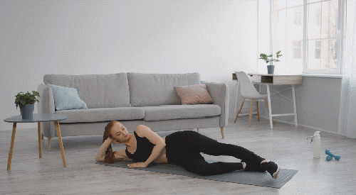 오른쪽 측면을 매트에 대고 옆으로 누워서 시작하세요. 오른손은 머리를 지탱합니다. 그리고 왼쪽 다리는 공중으로 들었다가 내리면서 30초 동안 운동하세요. 이번에는 반대편으로 돌아서 눕고, 오른쪽 다리로 동일하게 30초 진행합니다.