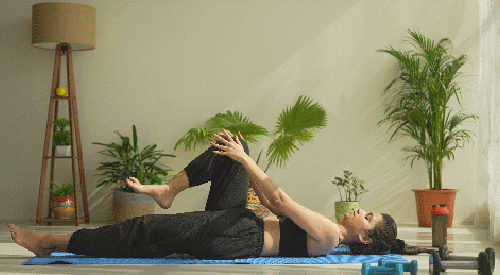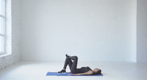 매트에 누운 상태로 자세를 편안하게 잡습니다. 그리고 오른쪽 무릎을 당겨주세요. 양손으로 정강이를 감싸고, 스트레칭을 강화합니다. 이번에는 왼쪽 무릎을 당기면서 동일하게 반복하세요. 1분 동안 다리를 당기는 동작을 진행합니다.