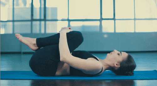 매트에 편안한 자세로 눕습니다. 그리고 다리는 들고, 무릎을 구부리세요. 무릎을 상체 방향으로 최대한 당깁니다. 그런 다음 정강이에 손을 올리고 당기면서 스트레칭을 강화하세요. 등은 바닥에 완전히 붙입니다. 1분간 운동하세요.