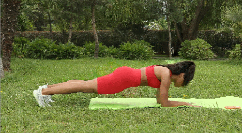 매트에 팔뚝을 대고 엎드려서 팔꿈치 플랭크 자세를 잡습니다. 그리고 복부에 힘을 주면서 자세를 곧게 뻗은 상태로 유지하세요. 시선은 바닥을 향하면서 버티면 되는데요. 1분을 목표로 버티는 시간을 점차 늘립니다.