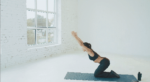 매트에 무릎을 꿇고 앉아서 시작하세요. 그리고 팔을 머리 위로 뻗습니다. 그런 다음 엉덩이를 들고, 상체를 앞으로 숙입니다. 몸을 앞으로 내렸다가 드는 동작을 반복하세요. 자세를 유지하면서 1분 동안 운동합니다.