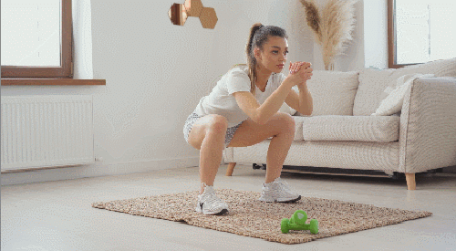 매트에 서서 다리는 어깨너비보다 넓게 벌립니다. 그리고 무릎을 구부리면서 엉덩이를 최대한 낮추세요. 이때 손은 가슴 앞에서 모으고, 시선은 정면을 응시합니다. 최대한 버텼다가 원래 자세로 돌아옵니다. 1분 동안 반복하세요.