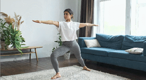 매트에 서서 왼쪽 다리는 뒤로 뻗습니다. 양발의 위치는 직선으로 맞추세요. 그리고 팔을 옆으로 펼칩니다. 무릎을 구부리면서 자세를 낮추세요. 30초 동안 운동합니다. 이번에는 발의 위치를 바꿔서 동일하게 30초 진행합니다.