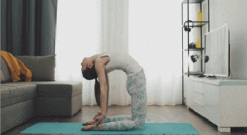 매트에 무릎을 대고 앉아서 시작합니다. 그리고 상체를 세우고, 천천히 뒤로 젖히면 되는데요. 손으로 발꿈치를 잡거나 발바닥을 잡아주세요. 몸을 충분히 확장시키고, 버티면 되는데요. 1분 동안 운동합니다.