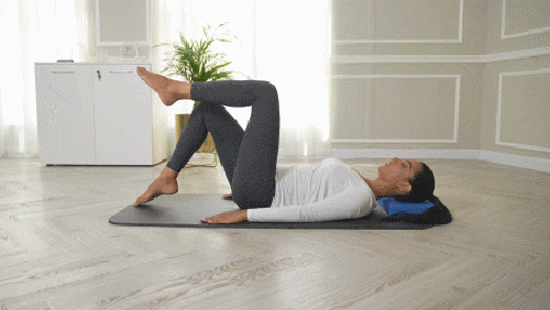 매트에 누운 상태로 손은 복부 위에 올립니다. 그리고 다리는 천천히 공중으로 높이 들어서 바닥과 90도 각도를 만드세요. 다리 사이는 벌어지지 않도록 붙이고, 발끝은 뻗어줍니다. 그런 다음 원모양을 그리면서 다리를 돌려줍니다. 1분 동안 반복하세요.