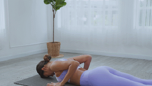 매트에 배를 대고 엎드려서 시작하세요. 손을 바닥으로 밀면서 상체를 들고, 코브라 자세를 만듭니다. 골반을 바닥에 붙인다는 생각으로 가슴을 확장시킵니다. 팔에는 많은 힘이 들어가지 않도록 하고, 머리는 뒤로 젖히면서 스트레칭을 강화하세요. 1분간 운동합니다.