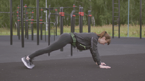 매트에 플랭크 기본자세로 엎드립니다. 그리고 엉덩이를 들면서 다운도그 자세를 만들고, 동시에 왼팔을 오른발로 뻗어서 터치하고 돌아옵니다. 이번에는 엉덩이를 들면서 오른팔을 왼발로 뻗어서 터치하고 돌아오세요. 1분간 운동합니다.