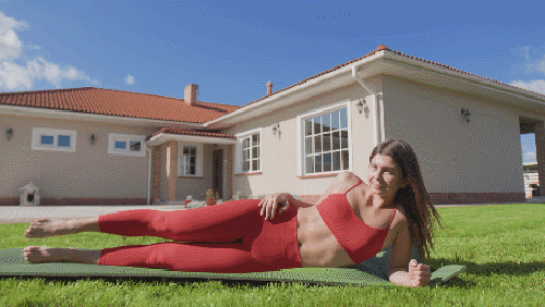 왼쪽 팔뚝을 대고 측면으로 돌아서 눕습니다. 그리고 오른쪽 다리는 공중으로 들었다가 내리면서 30초 동안 사이드 레그레이즈 동작을 진행하세요. 이번에는 오른쪽 팔뚝을 대고 측면으로 돌아서 눕고, 왼쪽 다리로 동일하게 30초 운동합니다.