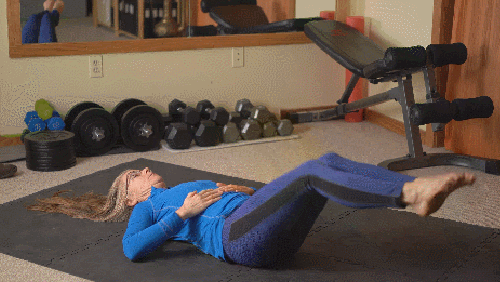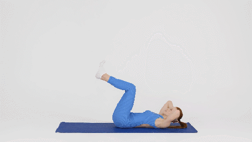 매트에 누운 상태로 팔은 바닥에 붙이세요. 그리고 다리는 공중으로 들어줍니다. 그런 다음 왼쪽 무릎을 당겼다가 내리면서 오른쪽 무릎을 당겨줍니다. 다리를 교차하는 동작을 1분 동안 반복하세요. 상체는 약간 일으켜서 복부를 압박합니다.