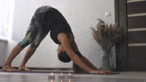 손은 바닥에 계속 대고 있으면서, 무릎을 꿇고 앉습니다. 서서히 아래로 향한 ㄱ자세로 바꾸어 줍니다. 다리를 곧게 펴고 뒤꿈치를 바닥으로 낮추세요. 팔 사이에서 머리가 편히 쉴 수 있도록 하고, 시선은 다리를 보거나 배꼽 위를 향하는 것이 좋습니다. 1분 동안 호흡하세요.