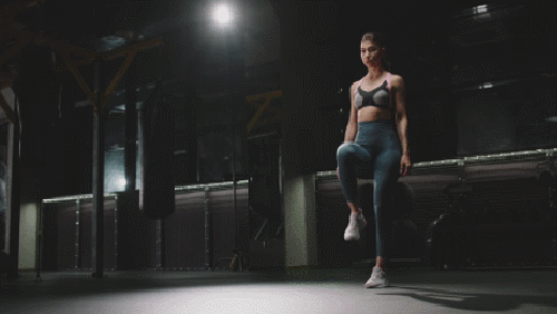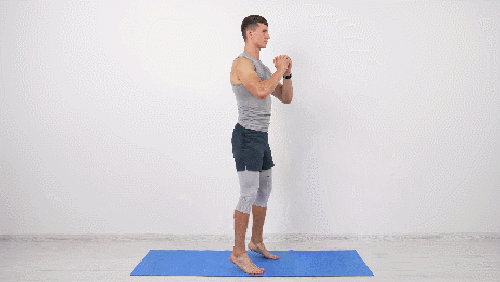 매트에 어깨너비보다 발을 벌리고 서서 시작합니다. 그리고 무릎을 구부리면서 스쿼트 동작을 진행하세요. 이때 손은 가슴 앞에서 모아줍니다. 일어서면서 발꿈치를 들어주고, 자세를 버팁니다. 1분 동안 반복하세요. 시선은 정면을 응시합니다.