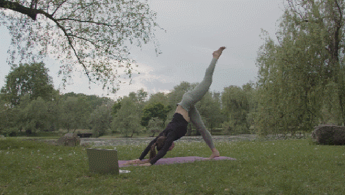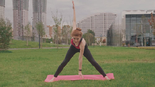 다리는 최대한 넓게 벌리고 매트에 서서 준비하세요. 그리고 상체를 앞으로 숙이고, 팔을 옆으로 펼칩니다. 그런 다음 왼손을 바닥으로 내리면서 오른손은 공중으로 올리세요. 이번에는 오른손을 바닥으로 내리면서 왼손을 공중으로 올립니다. 1분간 운동하세요.